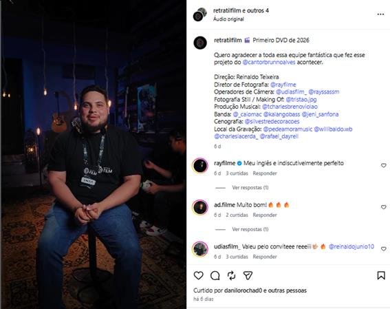 Com ampla experiência em produções multicâmera, direção de captação e eventos de grande escala, Reinaldo Teixeira se diferencia por transformar momentos únicos em histórias visuais autênticas. Seu trabalho eleva o padrão do audiovisual musical e fortalece a imagem de artistas em todo o país, consolidando-o como um dos nomes mais promissores da cena audiovisual brasileira.